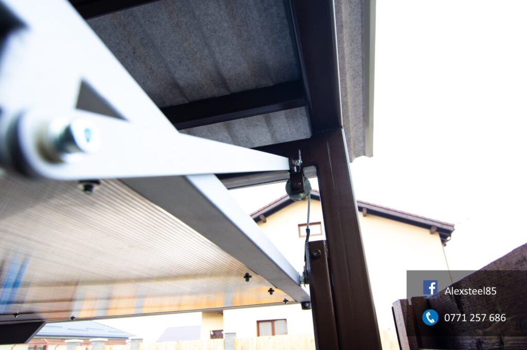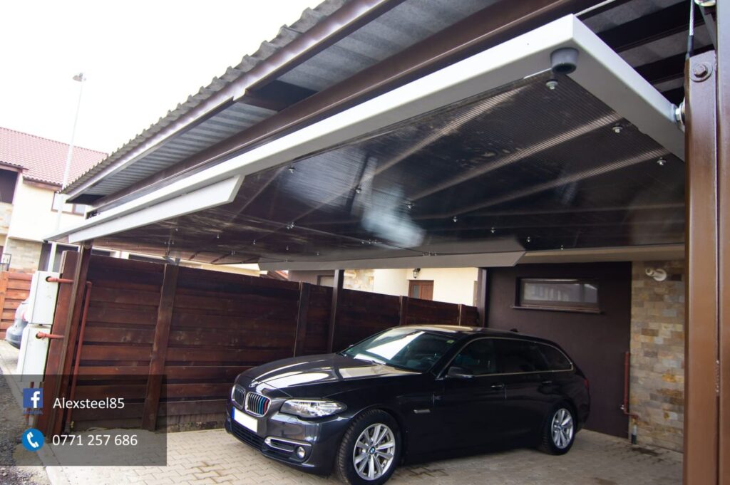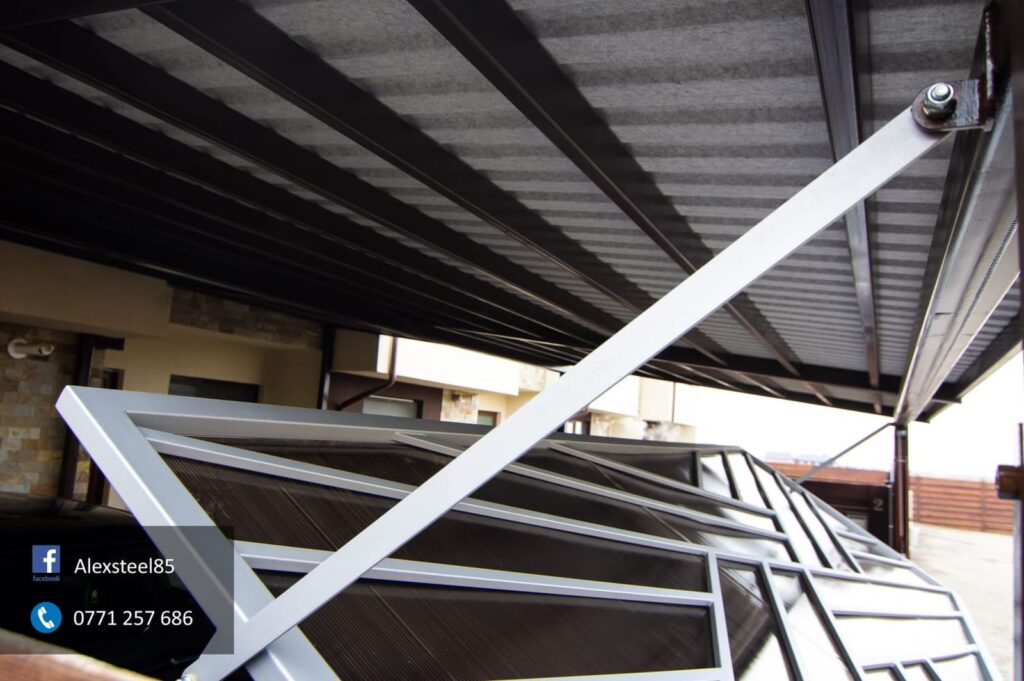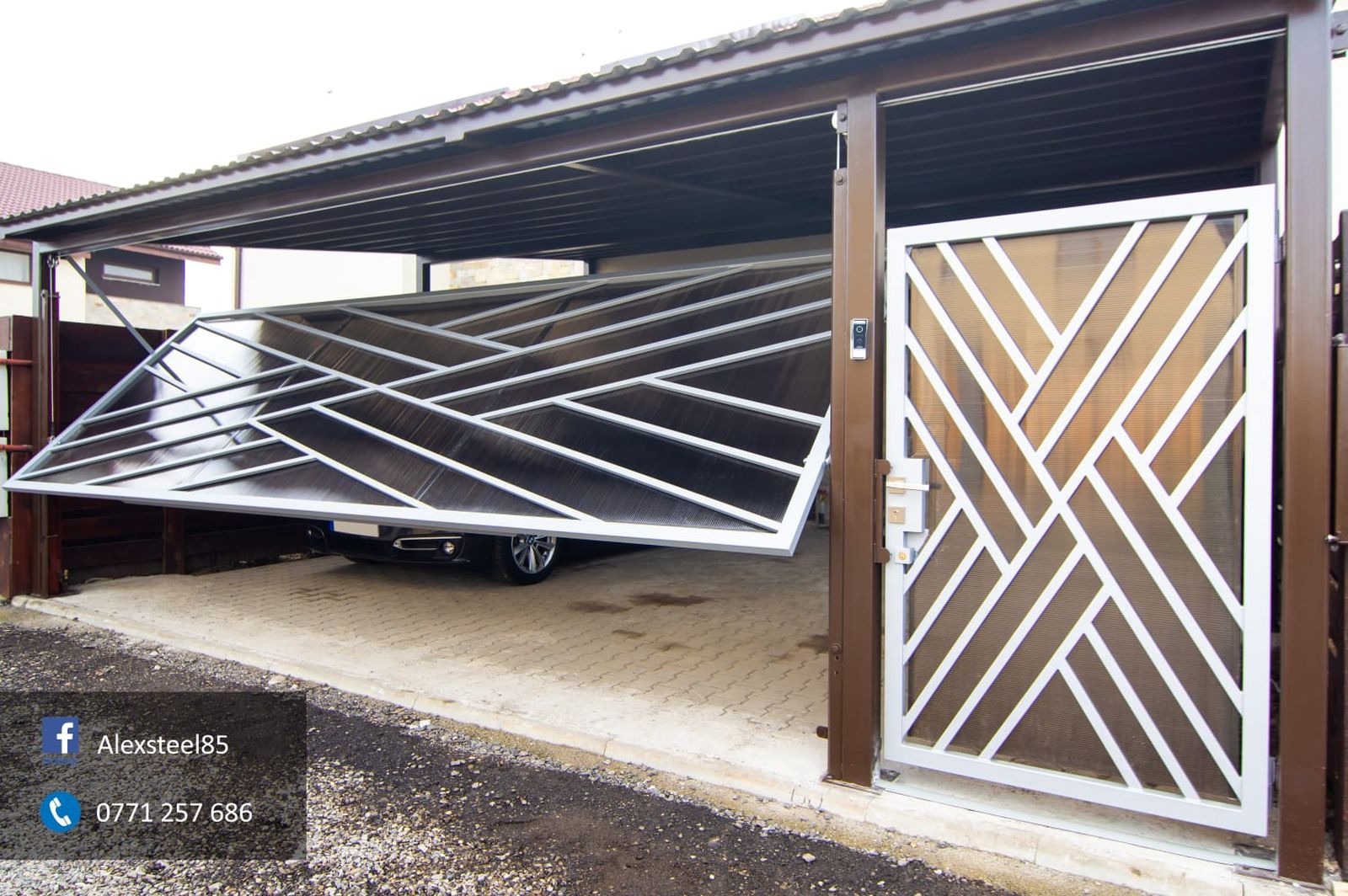 Poartă basculantă cu o dimensiune de 5,2 metri lungime și o înălțime de 1,8 metri, deschiderea porți basculante este de 1,9 metri, executată din profile rectangulare de fier cu un design propus de noi. Montajul s-a făcut pe structura carportului existent.