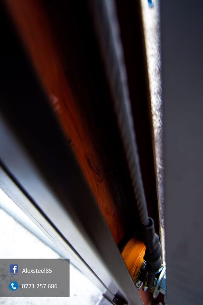 Poartă basculantă cu o dimensiune de 2,5 metri lungime și o înălțime de 1,93 metri, deschiderea porți basculante este de 1,9 metri executată din profil rectangular aluminiu, vopsită în câmp electrostatic. Componentele de susținere a porți sunt confecționate din tablă fier și îndoite la abkant. Montajul s-a făcut în interiorul structurii de beton existent.